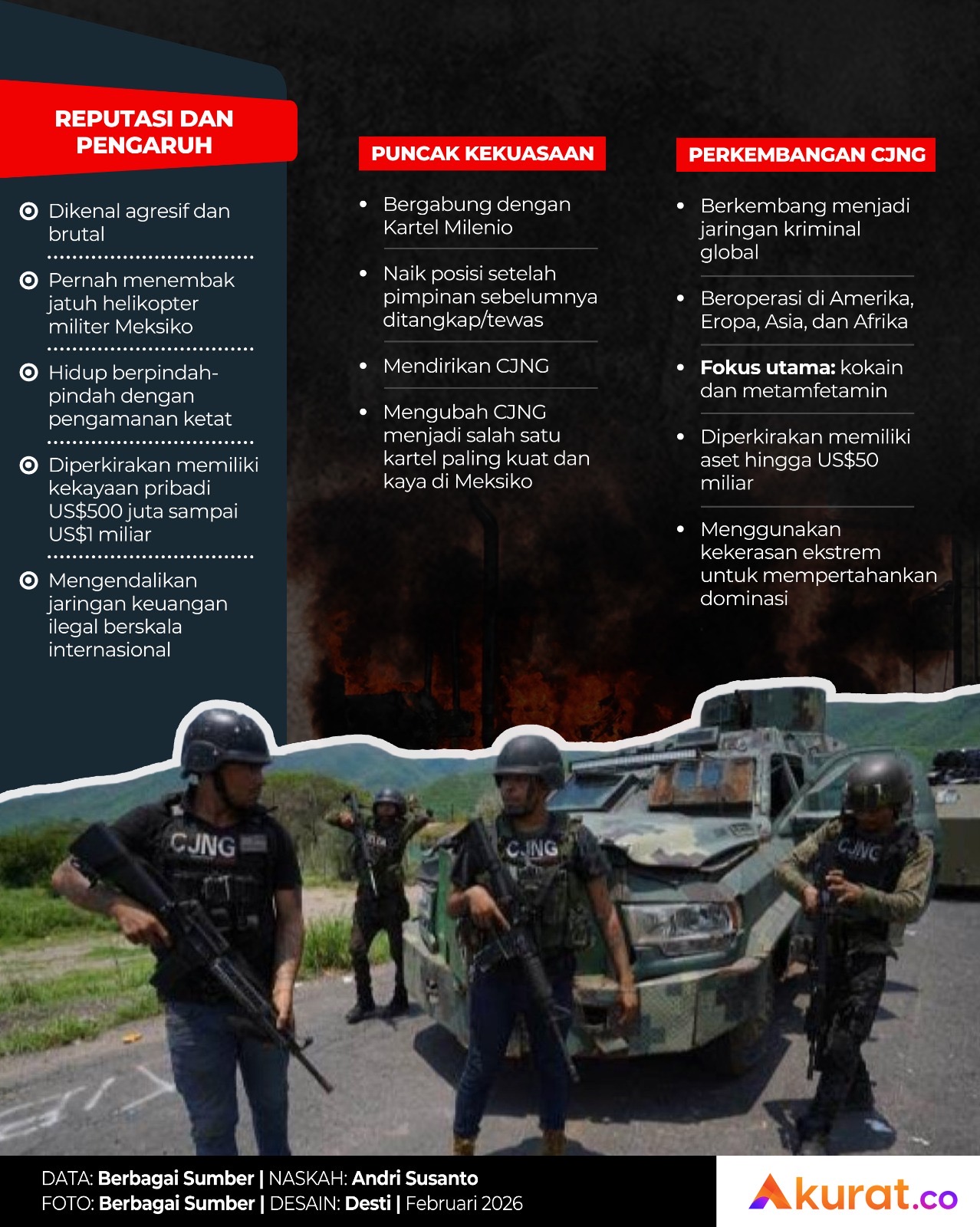 Kematian Nemesio Oseguera Cervantes alias El Mencho pada 22 Februari 2026 di Jalisco mengakhiri perburuan terhadap bos Jalisco New Generation Cartel (CJNG), salah satu kartel paling berbahaya di dunia.